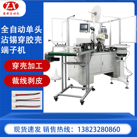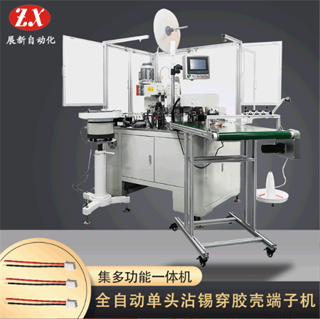 1、單頭穿膠殼機(jī)可適用2P并線、兩條電子線的單端沾錫、壓接及穿殼加工。適用于125端子、20端子、2.5端子等。裁線長(zhǎng)度25-450mm。