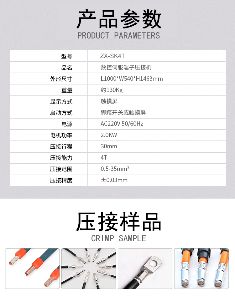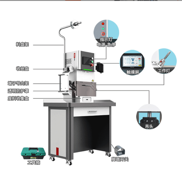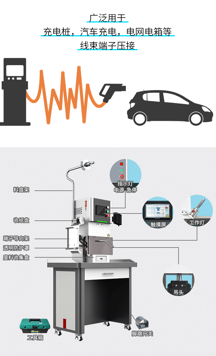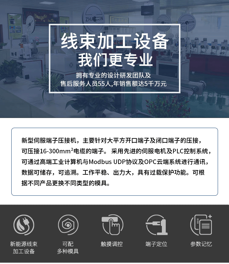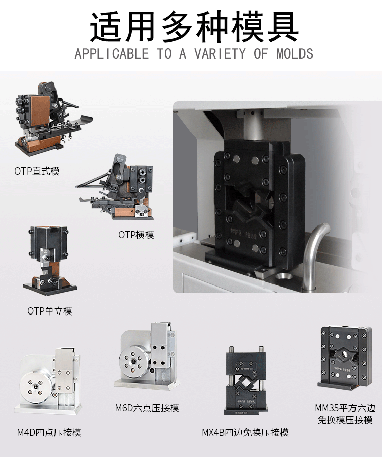 ? 低噪音、低能耗、無污染,占地面積小; ? 功能實(shí)現(xiàn)端子壓接、折彎、成形等一次完成,可任意更換多種模具。 壓接數(shù)值具有智能計(jì)