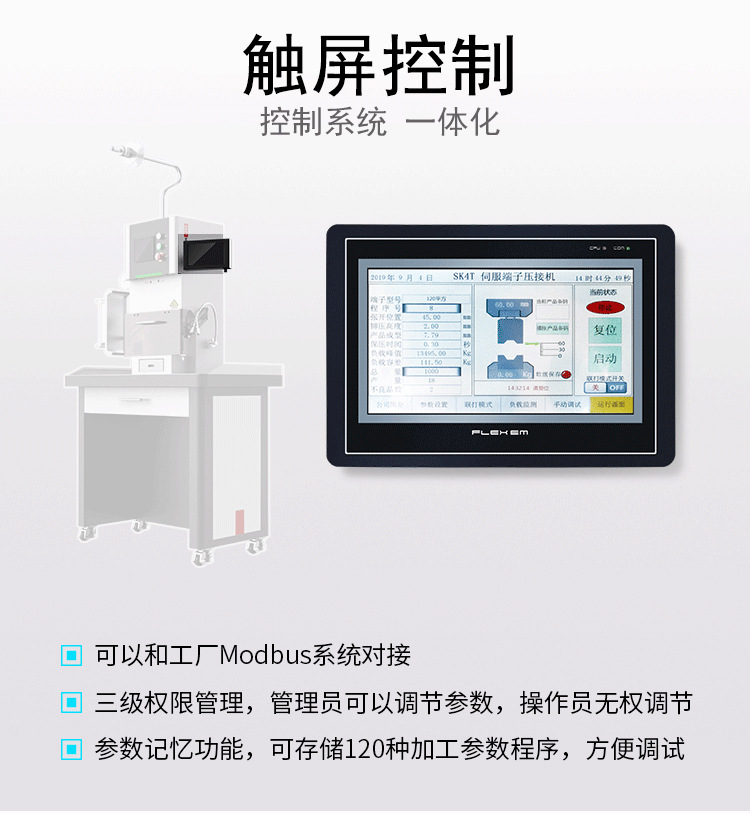 產(chǎn)品說明:該設(shè)備是一款新型自動(dòng)智能伺服壓接設(shè)備,外形美觀,采用先進(jìn)的伺服電機(jī)、運(yùn)動(dòng)控制卡及工業(yè)計(jì)算機(jī)控制系統(tǒng),直觀的了解及設(shè)定工作參數(shù),操作簡(jiǎn)單,功能齊全極具人性化,權(quán)限等級(jí)管理功能,數(shù)據(jù)管理更方便,使用更安全。