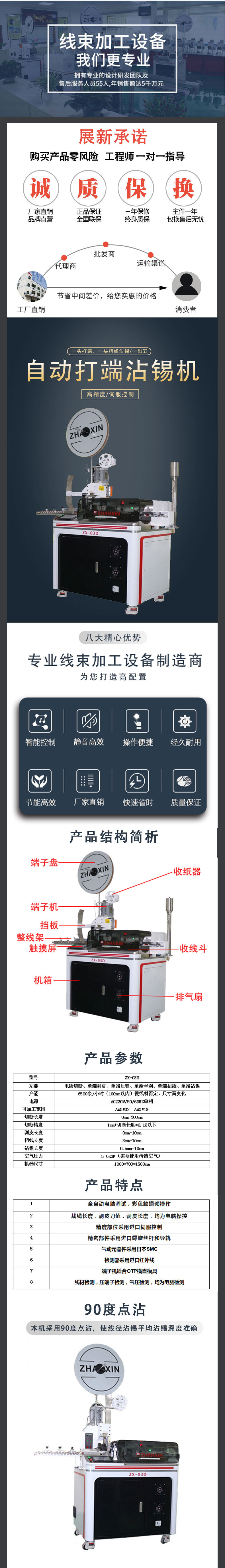 深圳市展新自動化設(shè)備有限公司成立于2003年,是一家專業(yè)生產(chǎn)線束末端加工設(shè)備的企業(yè),源于臺灣的生產(chǎn)技術(shù),以及臺灣的專業(yè)的技術(shù)人員,專業(yè)制造:全自動雙頭端子機,全自動單頭端子機,全自動伺服端子機,全自動伺服沾錫機(單/雙頭),新能源壓接機等自動化設(shè)備。為繼電器行業(yè),電子電器行業(yè),汽車線束行業(yè),新能源線束加工等等,提升產(chǎn)業(yè)結(jié)構(gòu)起到巨大作用,為廈門宏發(fā)股份、河北申科集團、順德美的集團、湖南威勝集團、三一重能、珠海格力集團以及海內(nèi)外各大型電子生產(chǎn)廠商提供配套優(yōu)質(zhì)的產(chǎn)品及完善的售后服務(wù),已全面通過SGS認(rèn)證,ISO質(zhì)量認(rèn)證。 客戶遍布中國廣東、北京、上海、浙江、江蘇、湖南、山東.印度、中東、巴西等東南亞以及歐美市場。展新自動化,因為一顆顆專注之心;為客戶提供優(yōu)質(zhì)的設(shè)備!為客戶創(chuàng)造價值,在線束末端加工設(shè)備上精益求精 ! 整合國際資源,拓展海外市場,放眼未來,展新自動化將繼續(xù)保持精準(zhǔn)的技術(shù)創(chuàng)新的精心,敬業(yè)的態(tài)度,再創(chuàng)新的輝煌 !